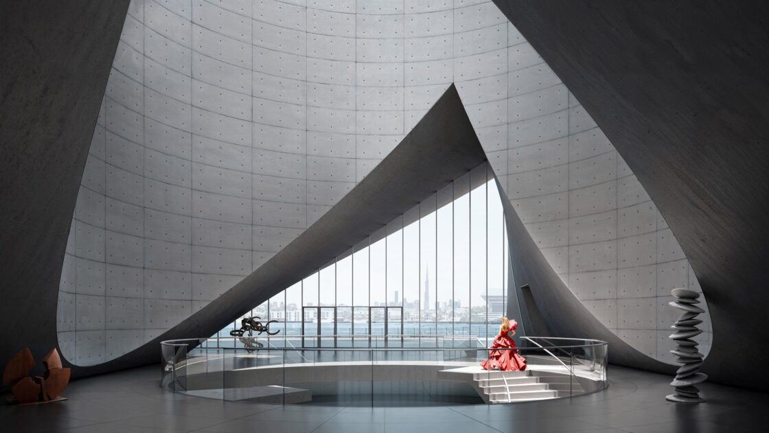 Le design du bâtiment a été confié à Tadao Andō, maître japonais de l’architecture minimaliste et lauréat du prix Pritzker en 1995. Fidèle à sa signature, Andō a imaginé une œuvre sculpturale où béton brut, lumière et nature se rencontrent dans une harmonie poétique. Le musée s’élèvera sur une jetée artificielle du Dubai Creek, semblant flotter au-dessus de l’eau -un geste architectural à la fois sobre et spirituel, dialoguant avec la verticalité de la ville et la quiétude du rivage.