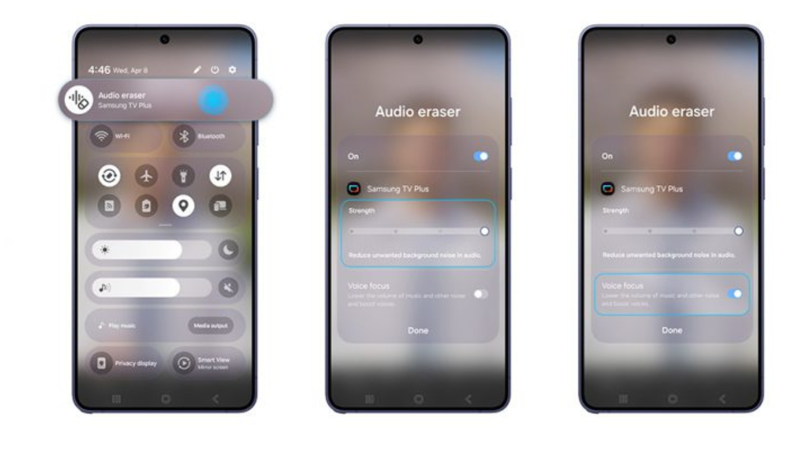 ▲ Accédez à la Gomme Audio via le panneau des Paramètres Rapides, ajustez l’intensité et activez le mode Voice Focus sur la série Galaxy S26.