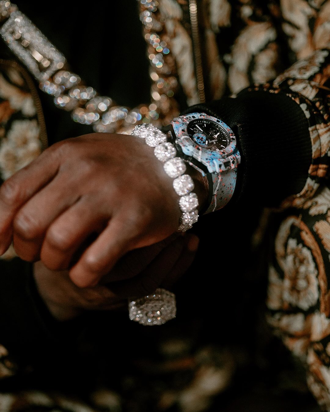 Point d’orgue de la soirée : la performance de 50 Cent, qui a enflammé la piste et portait une montre unique, la Big Bang Street Art MECA-10 ; un exemplaire spécialement conçu pour l’occasion et hommage aux codes visuels du rappeur et du film Street Fighter auquel il est lié. Hublot aurait offert une pièce unique à l’artiste, selon les communiqués et comptes-rendus de la presse présente.