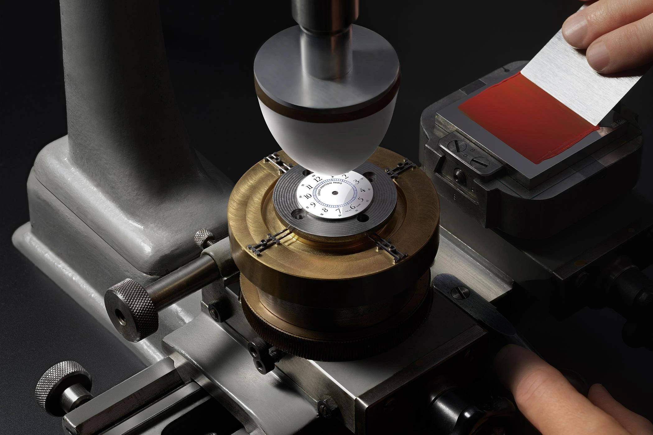 Sous son boîtier galet de 39 mm en or jaune, la montre dévoile un cadran en émail grand feu, fruit d’un savoir-faire rare où la matière devient lumière. Chaque nuance — rouge, bleu, noir – se révèle au fil de vingt heures de cuisson, entre 800 et 900 °C, pour un résultat d’une perfection silencieuse. L’équilibre est total : entre la rigueur du geste et la poésie du détail.