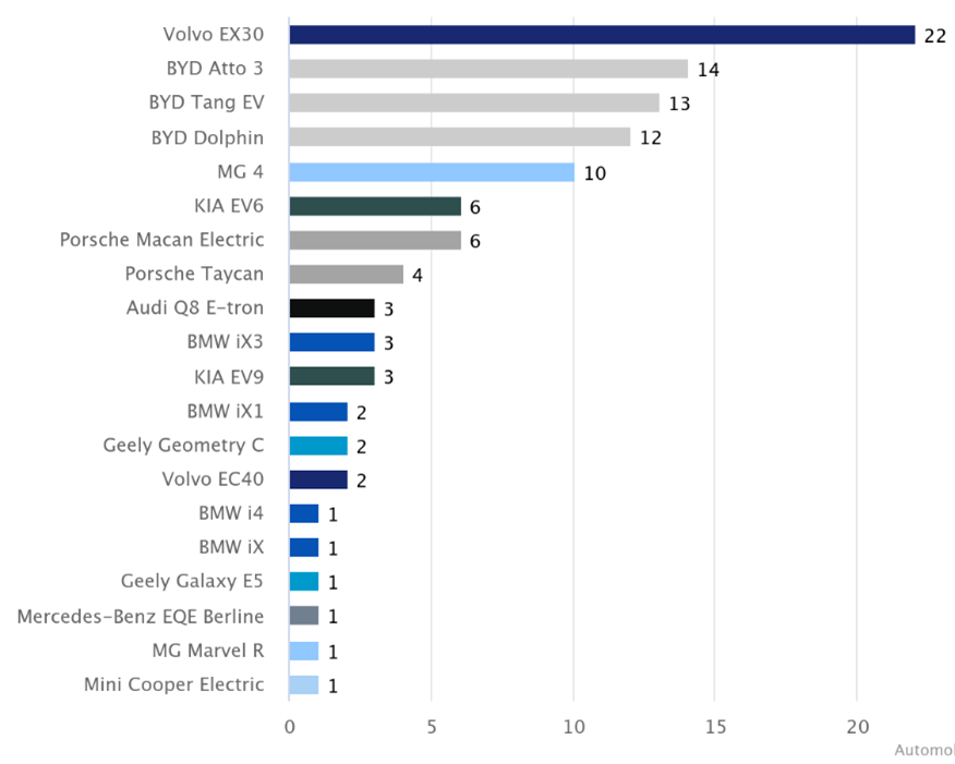 Volvo maintient son titre de « Voiture électrique la plus vendue en Tunisie » obtenue l’année dernière en continuant d’occuper la première place en 2025 arrêté à fin avril en se référant aux données statistiques d’immatriculation officielles. Le fameux EX30 continue sa domination puisqu’il écrase son propre record de vente enregistré au mois de décembre 2024 (12unités) avec 13 unités de voitures électriques immatriculées au mois d’avril 2025.