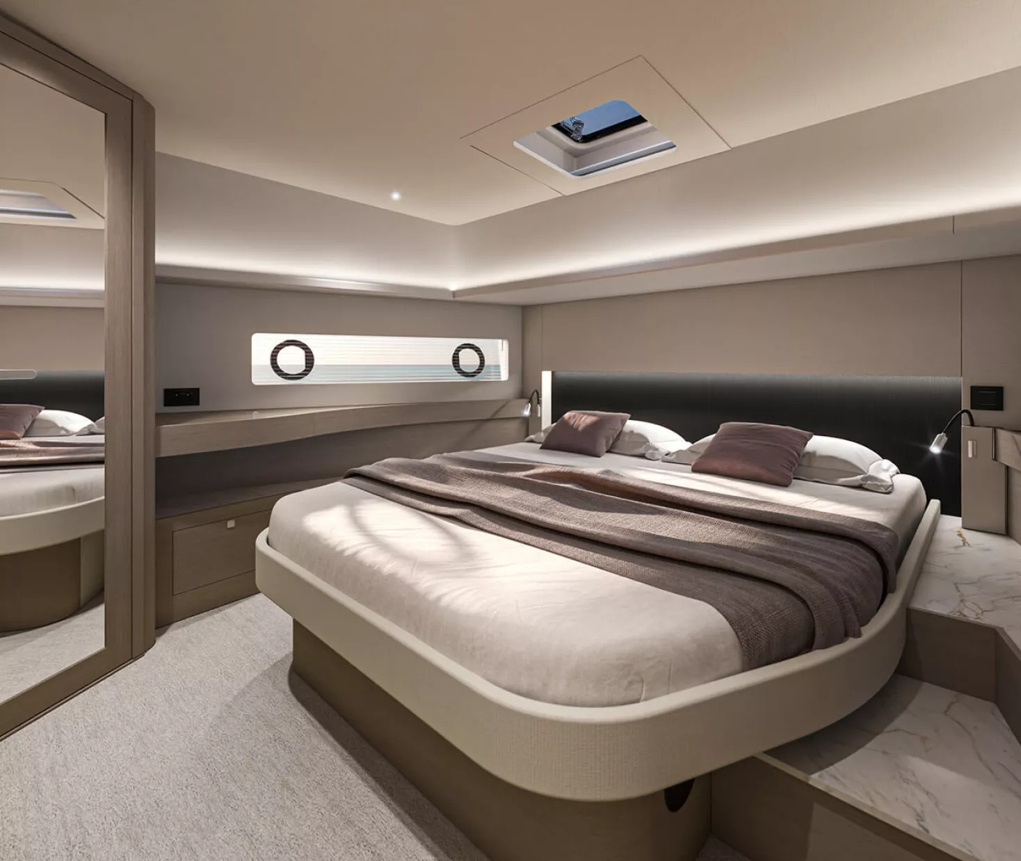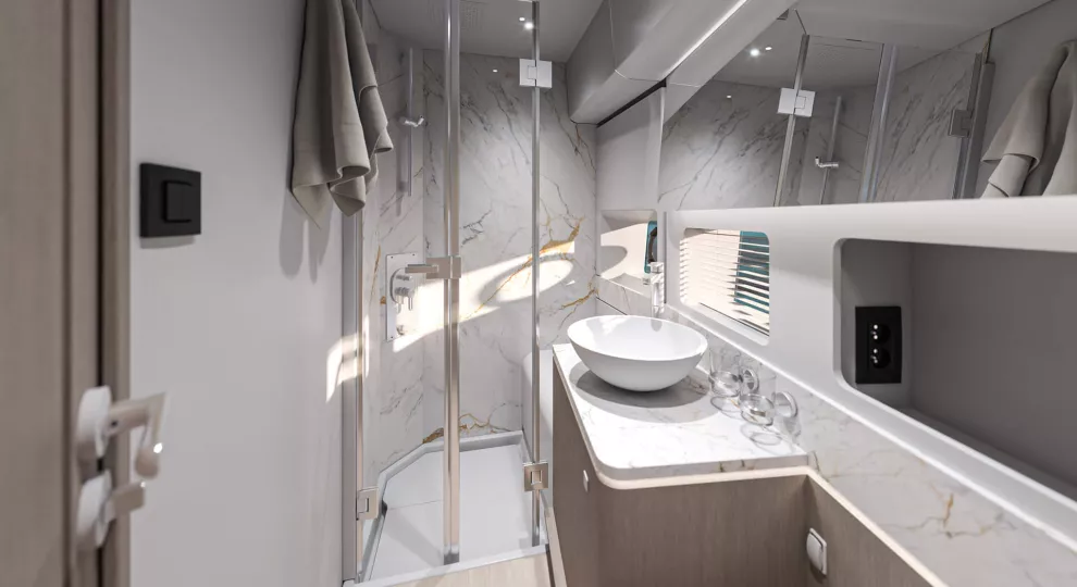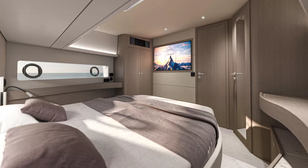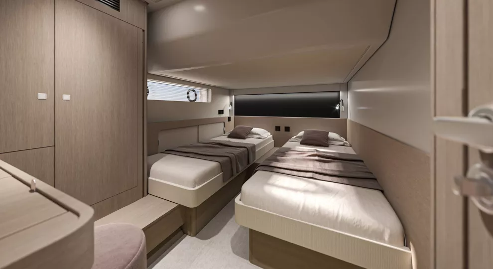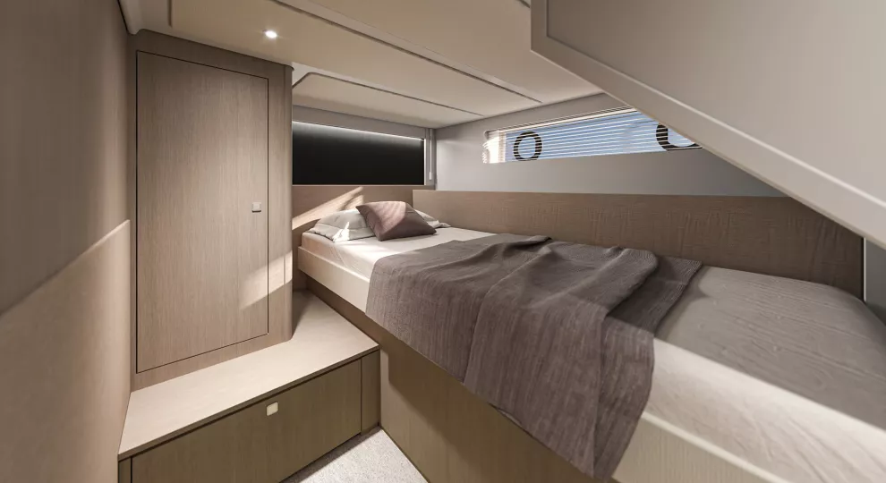 À l’intérieur, le Gran Turismo 50 surprend par son atmosphère douce et apaisante. Les matériaux nobles, les jeux de lumière, les teintes chaleureuses et une ergonomie exemplaire créent une ambiance où chaque détail respire le confort et la maîtrise. BENETEAU signe ici un intérieur d’une grande maturité esthétique, où le raffinement reste simple et évident.